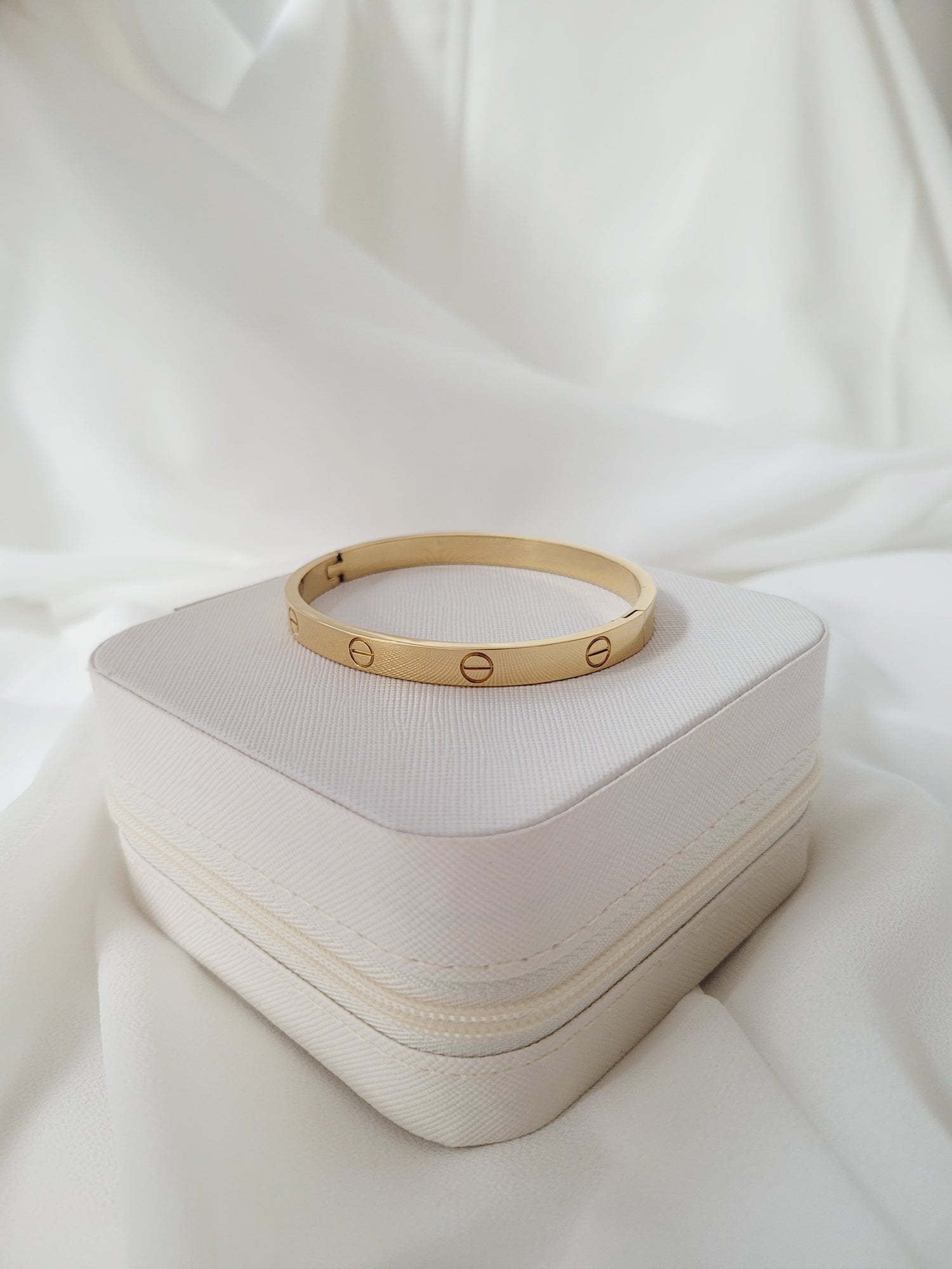 This timeless Love Swingle Bangle is designed to bring you joy, day after day. Crafted from stainless steel, it's totally waterproof and tarnish-free, so it will always stay in perfect condition. The gold color complements any look and ensures your bangle never goes out of style!