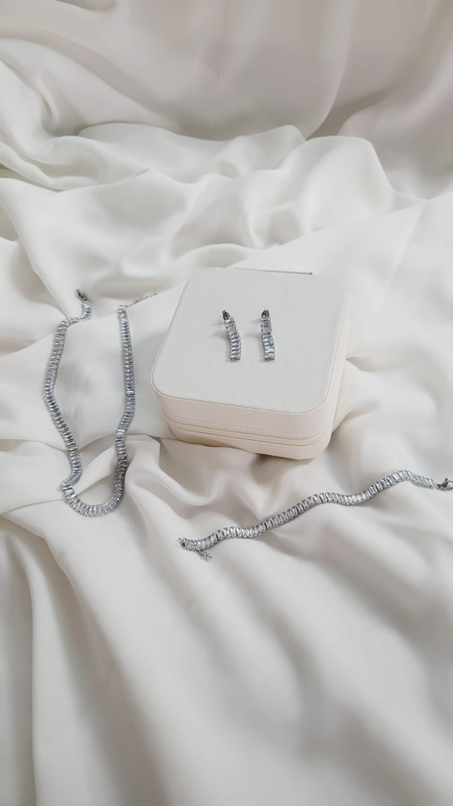 This Full Stone Set is the perfect blend of elegance and durability. Expertly crafted in silver color, each piece is made with premium materials that are both waterproof and tarnish-free, ensuring long-lasting sparkle and shine. The set includes a necklace, earrings, and a bracelet for a full match. Enjoy the brilliance of diamonds with this luxurious set.