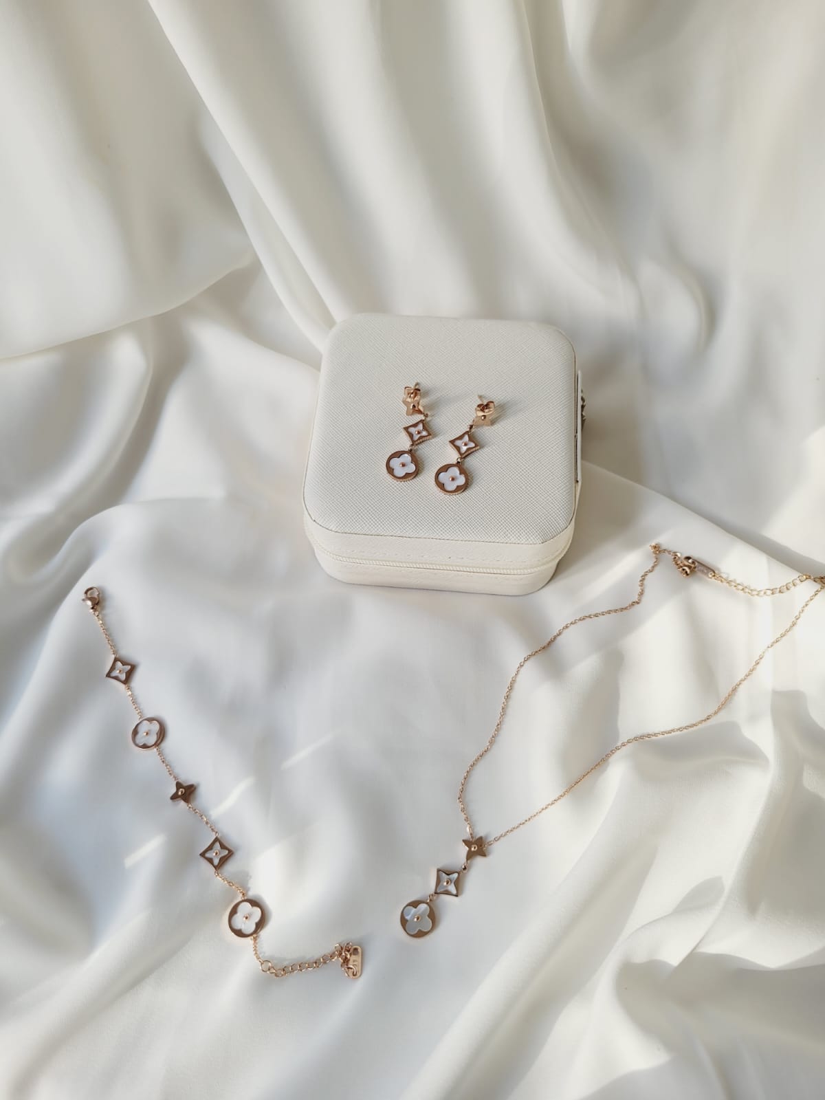The Rose Gold Blossom set is a timeless and chic addition to your jewelry collection. Crafted with stainless steel, it is resistant to water, tarnish, and corrosion. With a bracelet, earrings, and necklace in matching rose gold finish, this set is sure to be a staple in any wardrobe.