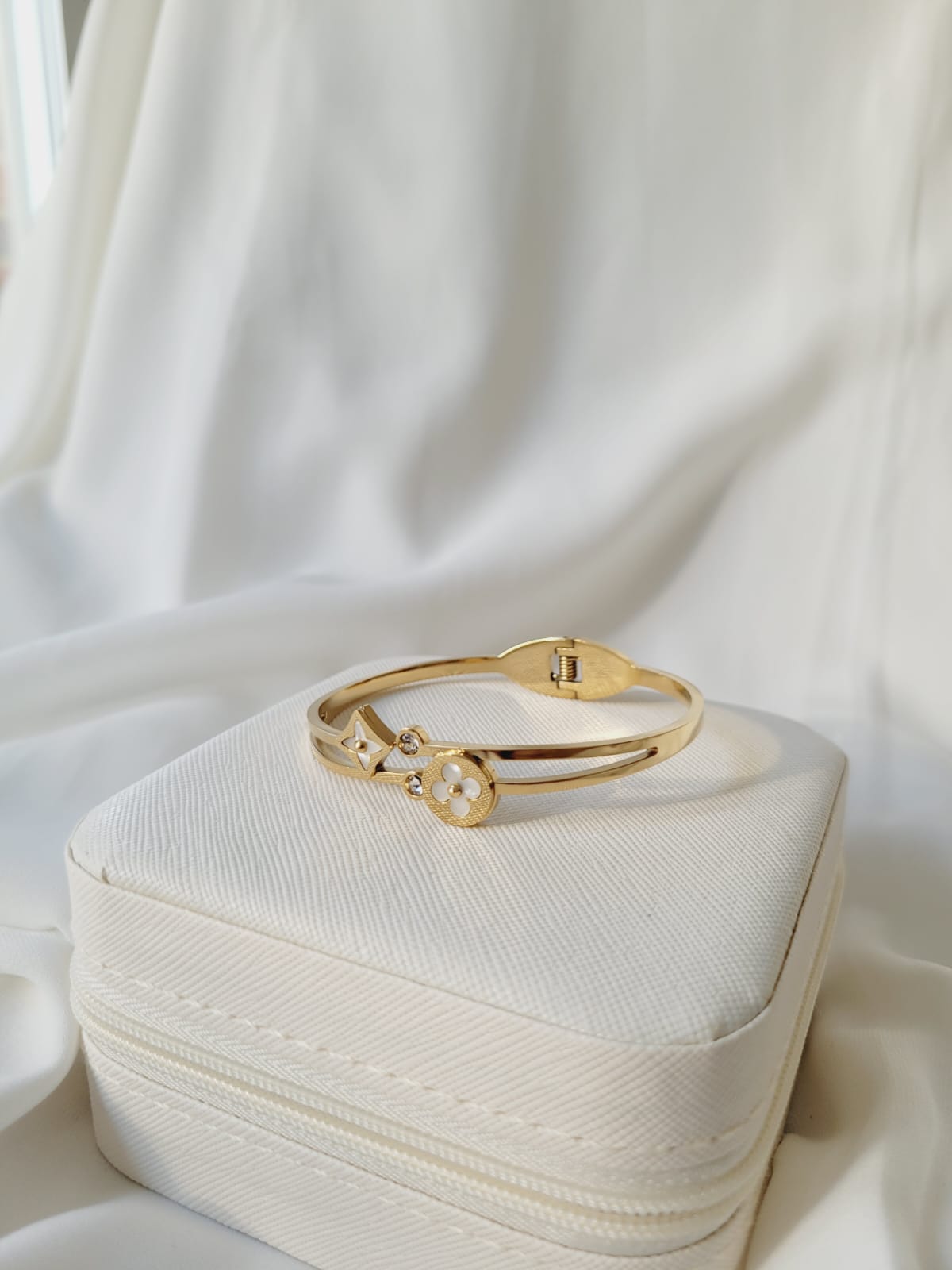 This Double Blossom Bangle is crafted from stainless steel, making it waterproof and tarnish-free. The gold plating gives it a classic finish and ensures its long-lasting wear. Perfect for adding a touch of style to any look, this piece is sure to last.